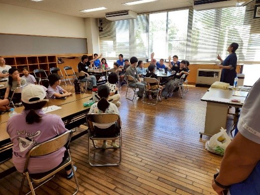 午後は、川西町のゴミ問題について意見を出し合い、ビンゴ形式のゴミ拾いを実施しました。さらにスイカ割りでは班ごとに協力し合い、声を掛け合って挑戦する姿が見られ、自然と譲り合いや助け合いの行動が生まれていたと思います。